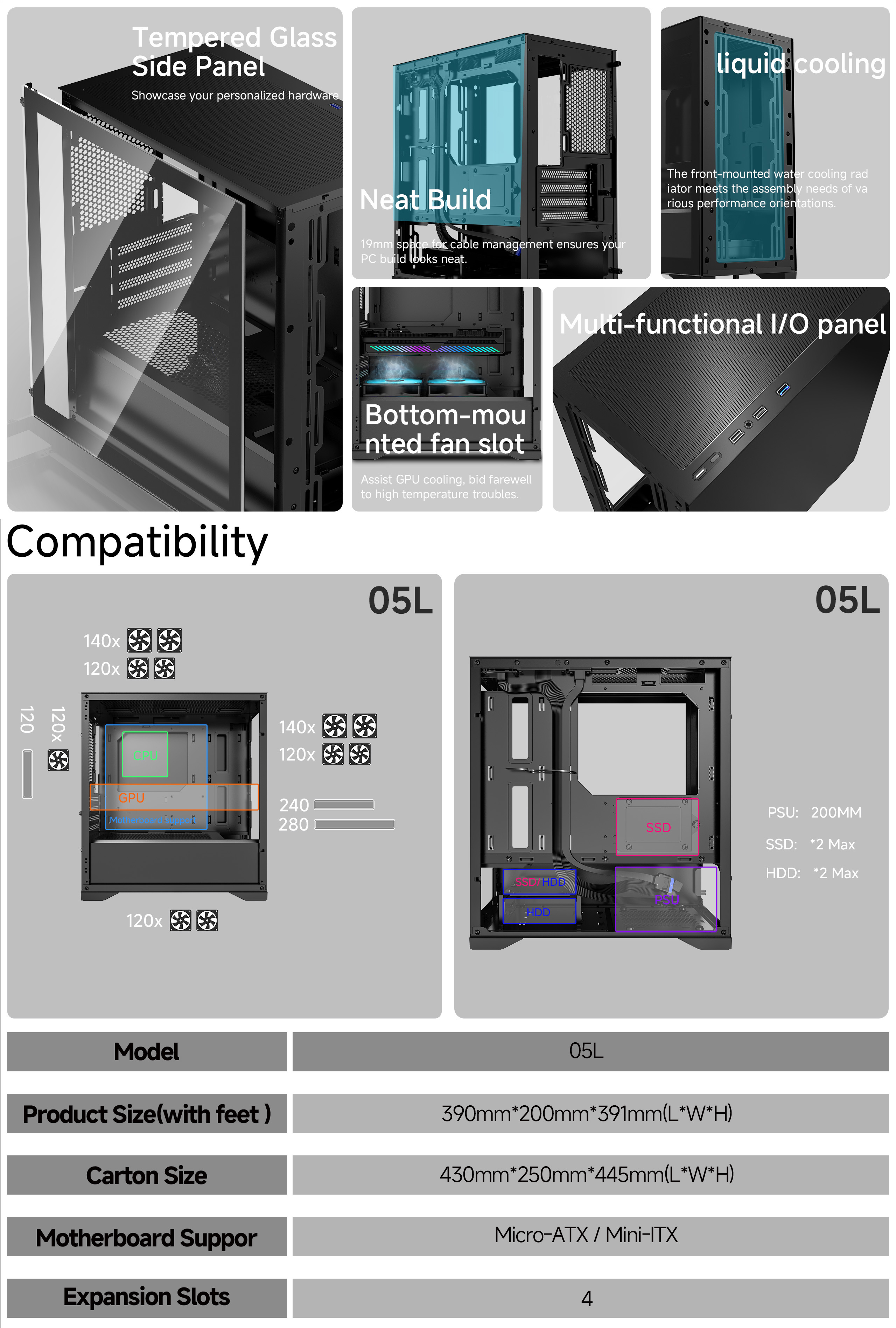 - Front panel compatible with 280mm water cooling radiator