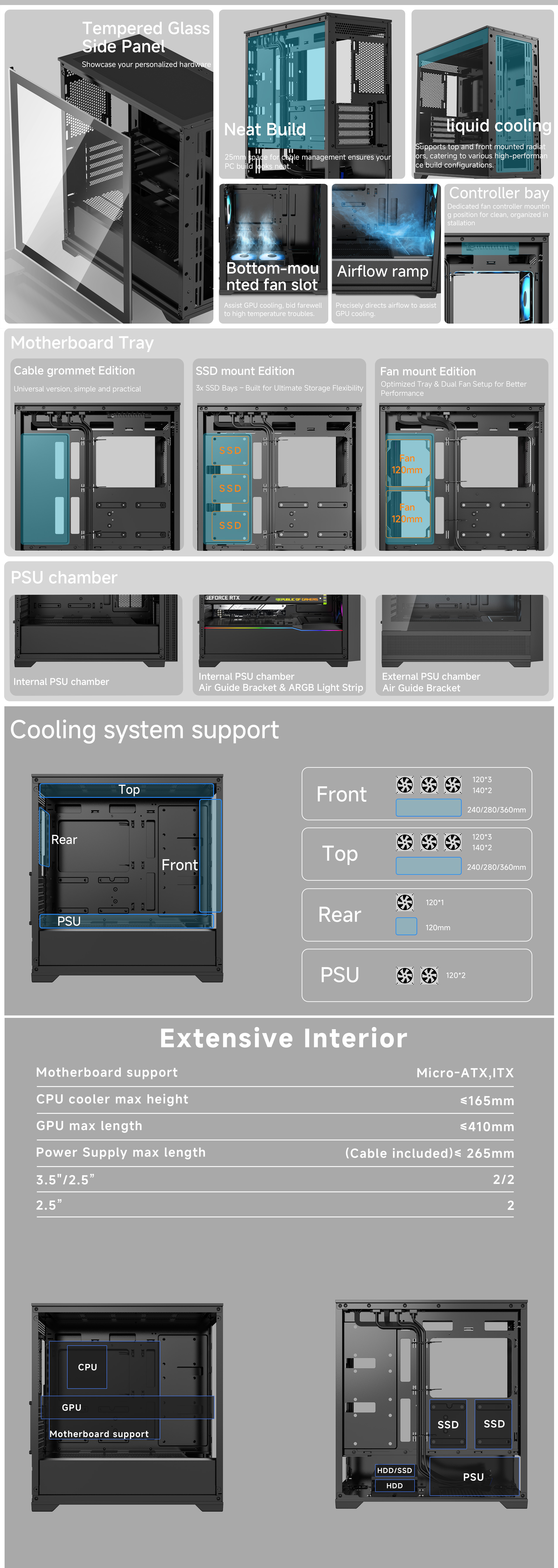 - Supports top & front radiator mounting, with multiple fan positions for high-performance builds.